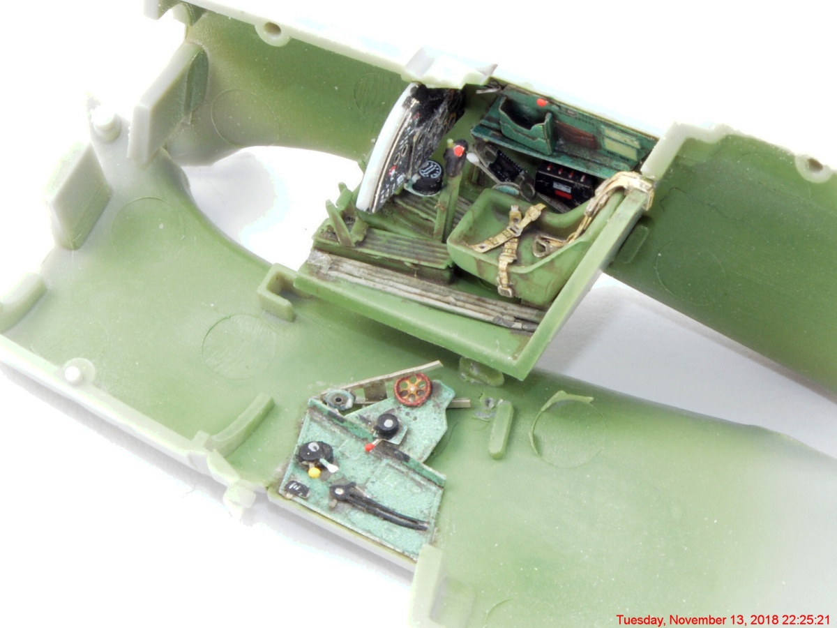 Kokpity sú zostavené. Použil som leptané sady Kuivalainen 72008 (výrobca Eduard). Základná farba interieru je zelenošedá Tamiya XF-71, detaily sú vymaĺované vodovkami Vallejo Color a Revell Aqua a mierny wash nanesený prípravkami Ammo Mig.